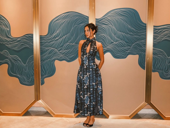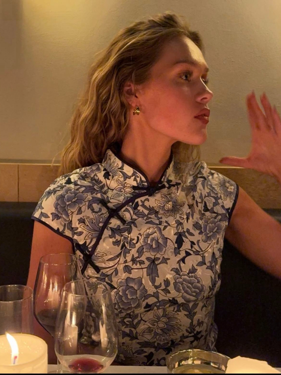 而现场更令大家惊喜的是,刚刚新婚的法拉利车队热门选手勒克莱尔的妻子Alexandra,在比赛现场身着定制旗袍亮相,其中这件蓝色旗袍的印花设计,巧妙融合了法拉利创始人的中文版名言,既是对主办国和赛车精神的致敬,也展现了她非凡的时尚触觉与文化底蕴。