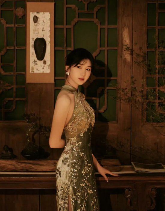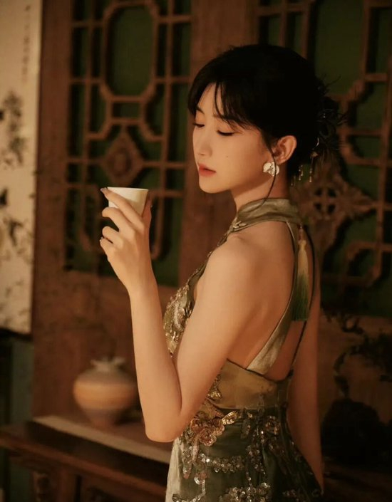 毛晓彤身着的改良旗袍褪去了传统的厚重,用橄榄绿丝绒打底,像把春日的青苔与茶烟揉进了面料,自带柔光滤镜。挂脖露背设计是点睛之笔,纤细的肩带勾勒出蝴蝶骨,后颈垂落的渐变绿流苏,随着动作轻晃,像风中摇曳的柳条,把中式含蓄的性感拿捏得恰到好处。