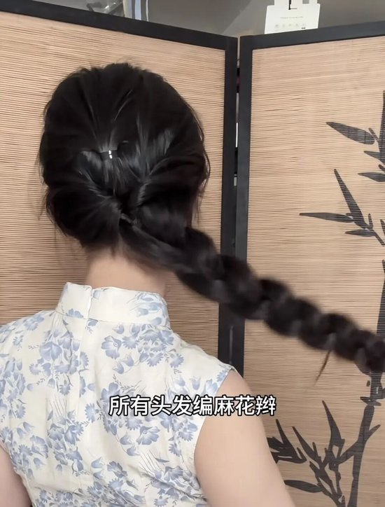 分出左侧一撮头发,穿过洞中,所有头发编麻花辫。