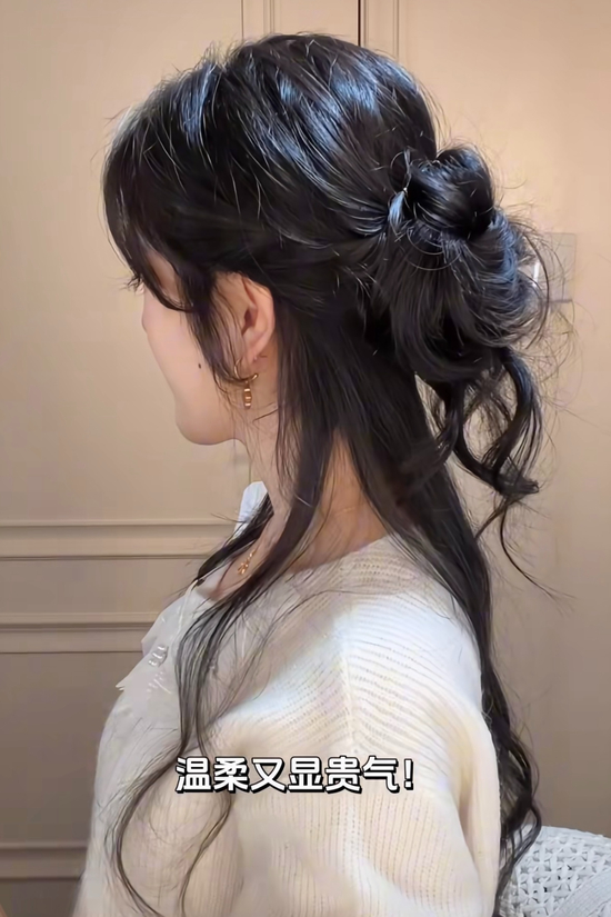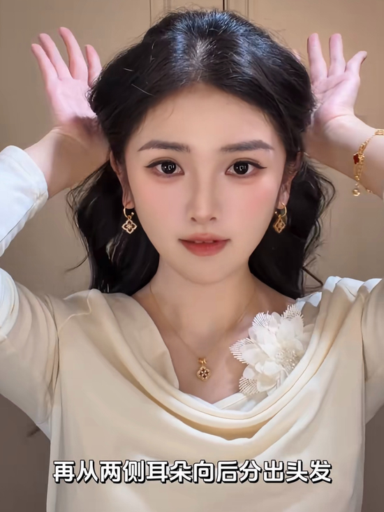 新中式的半扎丸子头也很容易上手,发际线三指后的头发向后梳,再从中间向后取一份头发,斜向要做发型那侧扎起来, 从两侧耳朵向后分出头发,扎起来向内翻转一圈。