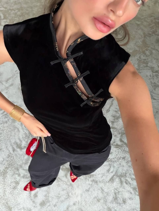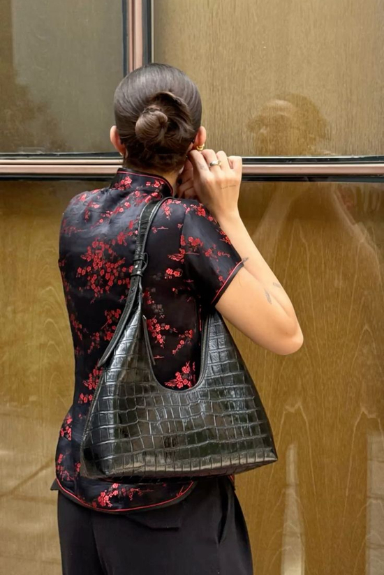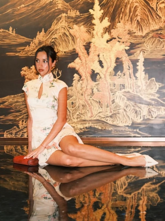 易梦玲身着立领造型和盖肩袖的短款旗袍,保留了中式骨架,但墨黑与豆绿的色块交错,把东方含蓄的性感变成了外放的辣妹感。裙身铺满重工花卉刺绣,牡丹、枝叶纹样顺着腰线蔓延,金棕与橘色的点缀让复古感拉满。