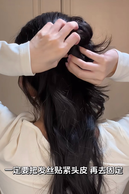 盘发也不能少,头顶取一撮头发扎住,两侧取头发合并扎住,掏洞往下翻。