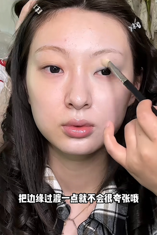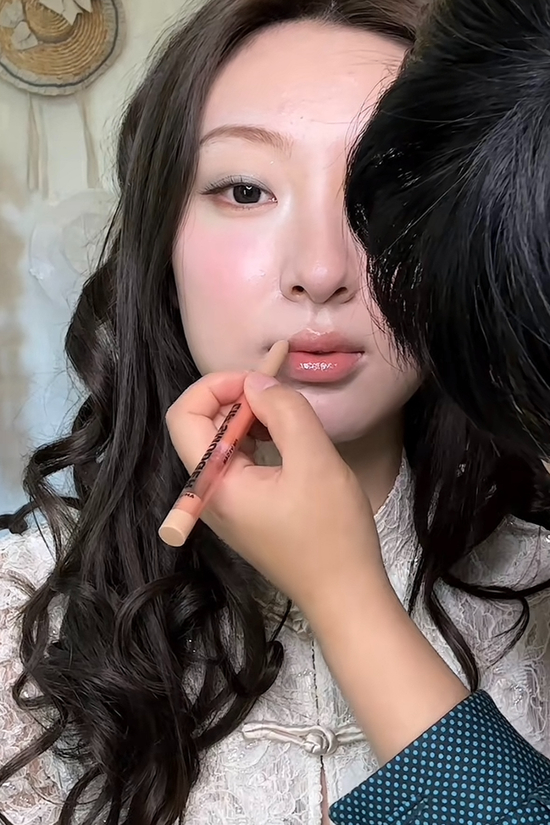 画出卧蚕后,将卧蚕阴影的前半段改浅,避免削弱古典感。唇妆部分先涂一层底色,再叠加口水色唇釉,最后用唇线笔过渡,打造出自然且有层次感的唇妆效果。
