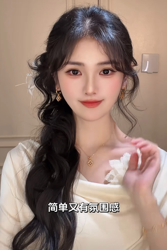 头发长的再重复一次这个操作,这样就会形成丸子的造型,放在耳后用一字夹固定。将剩下的头发放置一侧耳后,一个即简单又修饰脸型的发型就完成了。