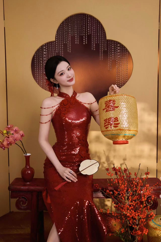 王楚然身穿SELENECHOW的定制改良旗袍,处处藏着东方巧思。挂脖设计大胆地露出纤细肩颈,几缕红丝链缠绕成温柔的“肩饰”,保留了旗袍的含蓄,又添了现代的灵动。裙身铺满细密的红亮片,在光影下流动着细碎光泽,走路时步步生光。