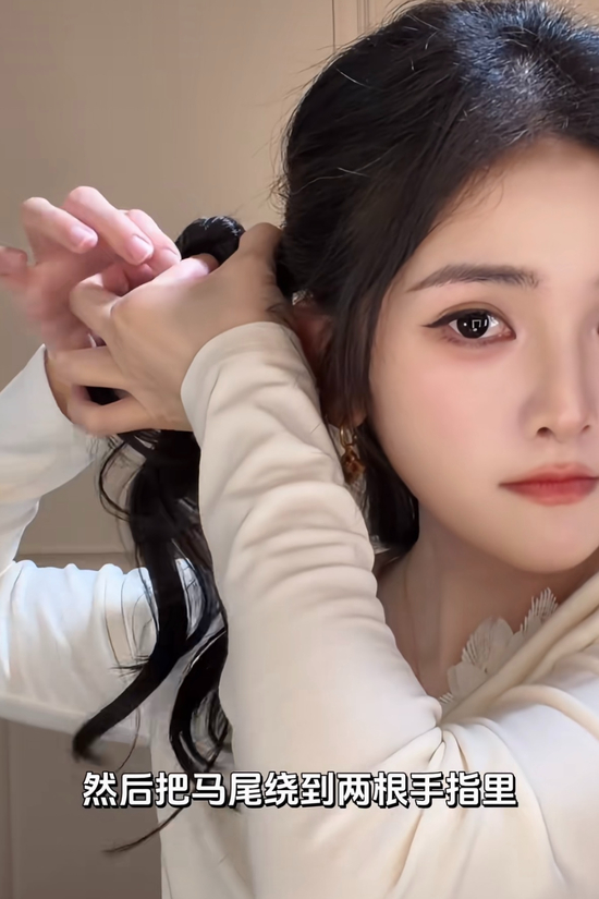 再从另一侧向上取头发,拧一拧麻花 从刚刚的洞里掏下来,两份头发合并,继续在侧边扎起来,拉出马尾上的一根皮筋,把两根手指向上穿,然后把马尾绕到两根手指里,捏起来向下拉。