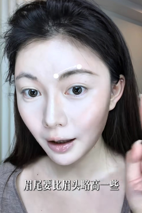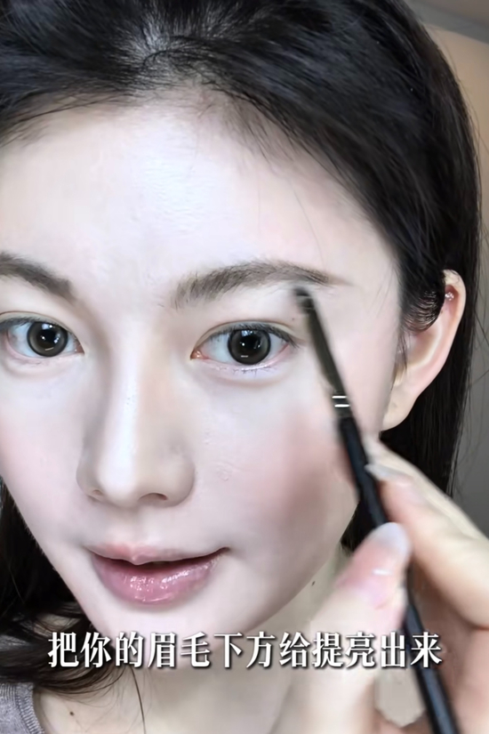 细节技巧:刷完眉毛后,用刷子上的余粉带一下山根,让面中更立体;用少量提亮液提亮眉毛下方,打造眉眼上扬感,使眉眼更开阔,同时视觉上有降低眼位的效果。