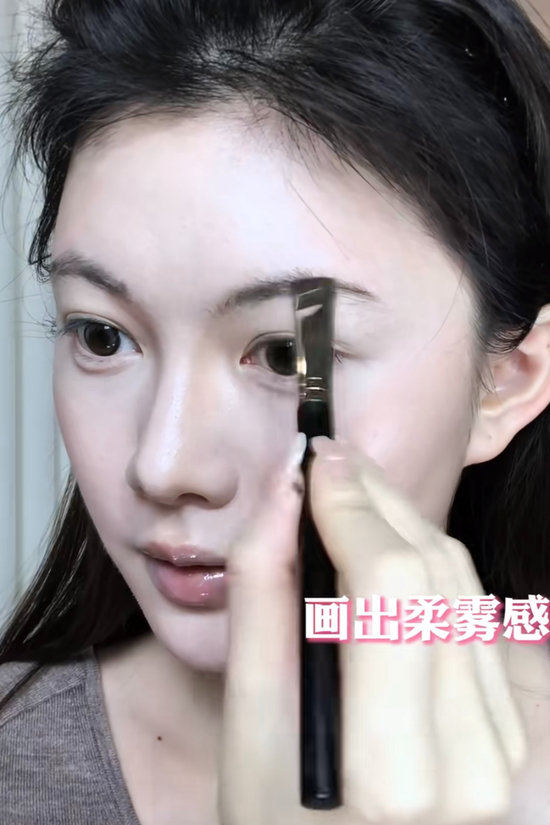 眉形塑造,可以用眉粉打底画出柔雾感眉形,眉型略长,眉尾比眉头略高一些,眉尾细细延伸,营造温婉感。
