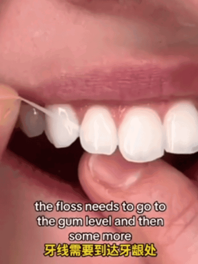 牙线的清洁位置需要轻轻进入牙龈边缘,先让牙线到达牙龈处,再顺着牙齿侧面轻轻滑入牙龈下方的区域,这样才能真正清理到牙龈沟中的残留物。