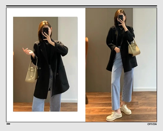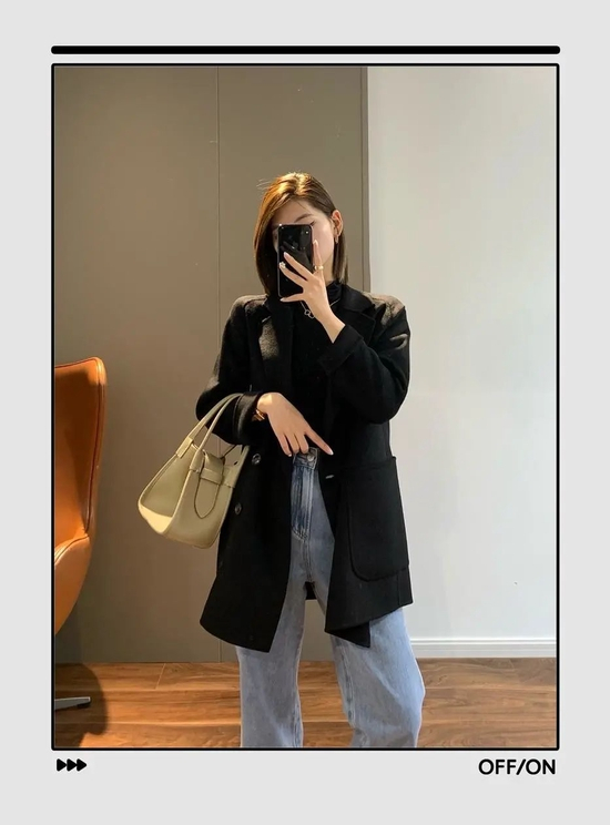 黑色西装与黑色针织衫的组合,确实挺干练,但是有点沉闷了。所以就需要搭一条牛仔裤,瞬间从死气沉沉中脱颖而出。