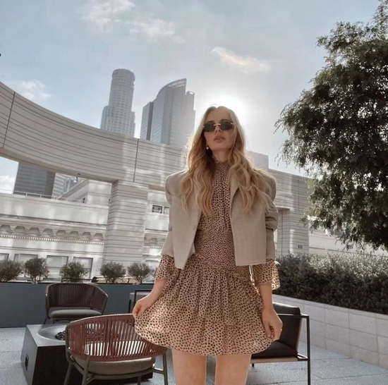短款西装不仅仅只有帅气和个性,也可以增加甜美氛围。裸色西装搭配粉色豹纹连衣裙,既有少女的青春又不失时髦一面。
