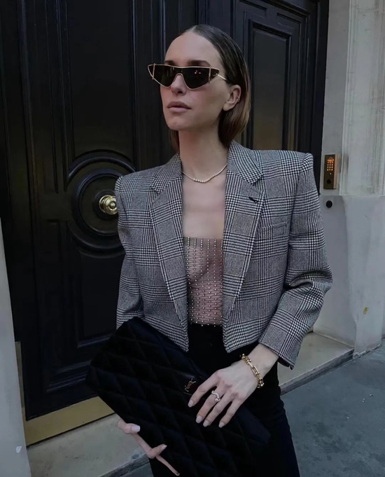 如果想尝试在穿搭上大胆一些,不妨学习时尚博主Pernille Teisbaek选择一款极具设计感的水钻内搭,若隐若现的性感加上千鸟格的短款西装,性感优雅的气质算是拿捏住了。