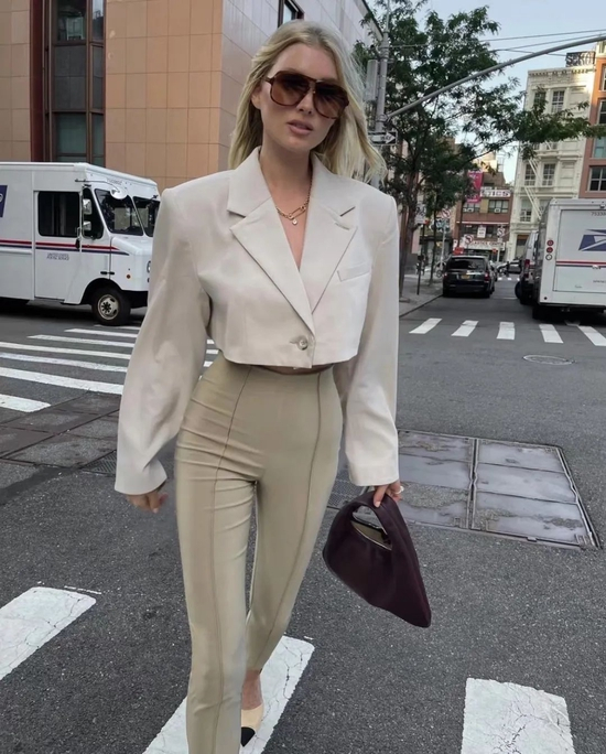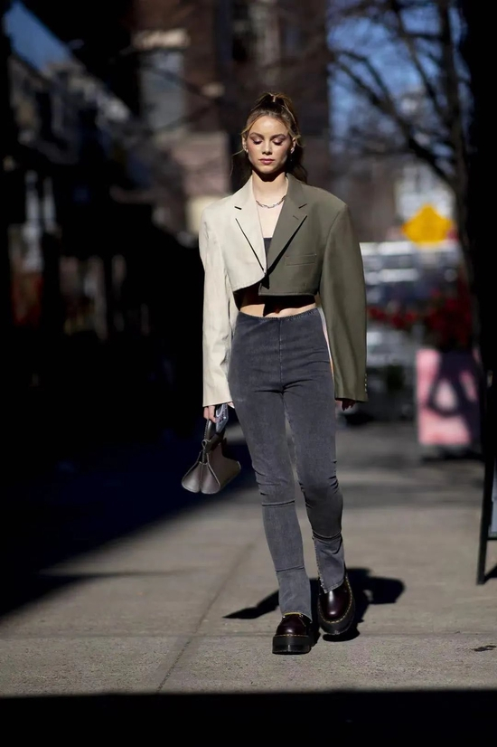 超模Elsa Hosk驾驭起辣妹风真的是毫不费力,莫兰迪色西装外套搭配同色系高腰裤把身材优势显露的淋漓尽致。