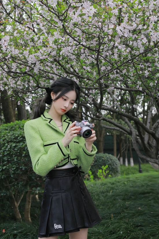 同样是绿色系短款西装,徐艺洋梳起双马尾搭配校园风的百褶短裙,满屏的青春感迎面而来,谁不想偶遇这样的美少女。