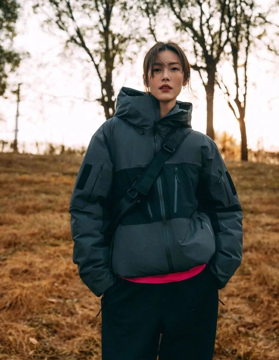 在刘雯的羽绒服造型中,口袋与拉链做了结合,胸前、腰间和上臂都有被拉链封住的口袋,拍照时刘雯将双手插进黑色宽松运动裤的口袋里,酷飒的同时又有种随意慵懒之感。