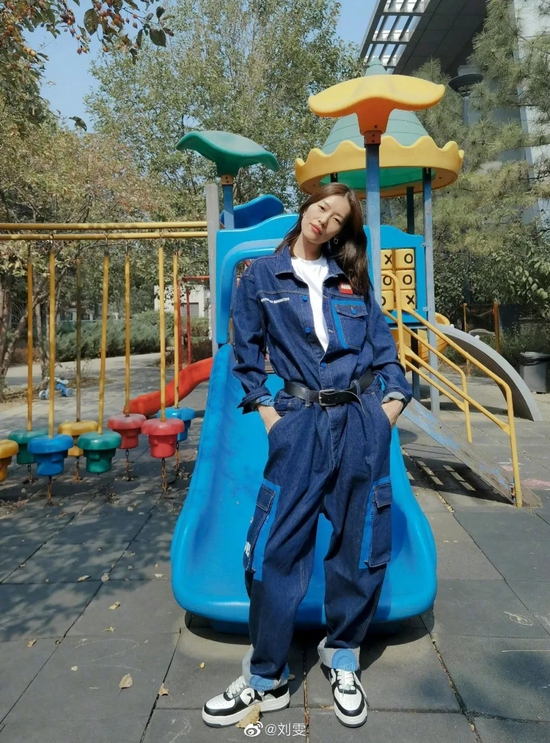 刘雯的牛仔连体裤上,胸前和侧边都有立体大口袋,口袋的蓝色滚边和纽扣与身后的蓝色滑梯相呼应,充满活力与童趣。