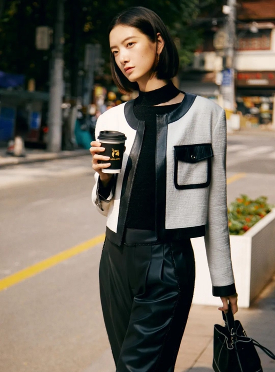 Cici项偞婧身穿白色小香风外套,胸前口袋饰以黑色皮质滚边和翻盖,一只手捧着咖啡,一只手拎着包包,优雅行走在城市街头,都市女性的摩登魅力扑面而来。