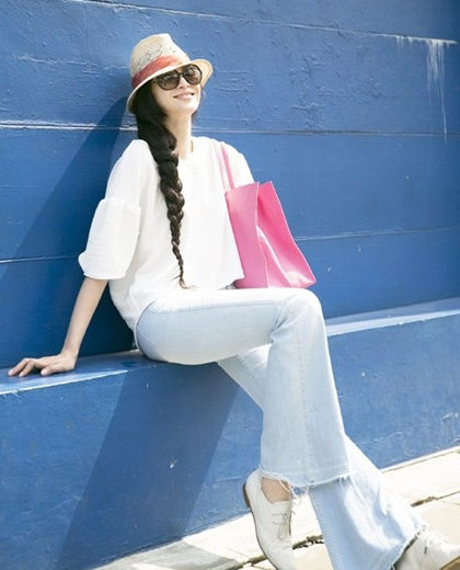 蝙蝠袖的T恤配上小脚牛仔裤,就这么简单,在夏季出游,不但方便更显青春活力。