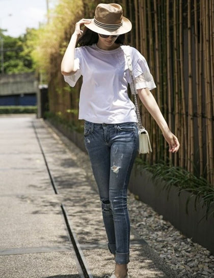 清爽的白色短袖衫,廓形和宫廷袖的时尚细节让简约款也不会乏味,搭配上浅色调的牛仔裤,清新自然。