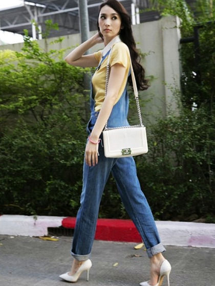 翻领T恤配上背带牛仔裤,配上白色高跟鞋和白色背包,清纯中带着帅气。