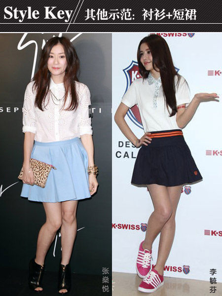 如果你是一个不甘于One-Piece的搭配狂,那么选择衬衫+短裙的搭配也一样是充满书卷气息的文艺搭配,特别是现时《冲上云霄2》掀起的制服风的潮流下,经典的衬衫搭配百褶裙更是时尚又清新,张燊悦和李毓芬都不约而同的选择了这样的搭配。
