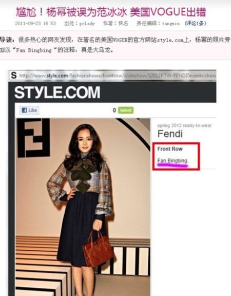很多国内媒体称赞杨幂造型不错颇有点小范冰冰的感觉。可是尴尬的是,当国内某些媒体称赞杨幂的时候,在著名的美国VOGUE官网上,杨幂的一张照片旁边却赫然写着FanBingbing 的注解,真是大乌龙。