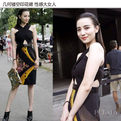 镂空是今年一大时髦关键词,尤其是在肚脐以上和腰部两侧的镂空,几何状镂空下的白皙肌肤性感又摩登。利落的后披直发、直直的剑眉,时髦大女人形象的塑造十分成功。脚上的尖头踝靴换成镂空设计的将会更加完美。