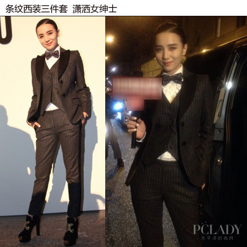 细条纹的西装三件套复古又潇洒,高挑的宋佳驾驭起来游刃有余,女绅士的利落造型即使在大咖聚集的时装周也格外惹眼。