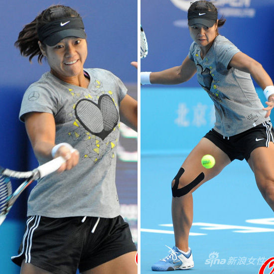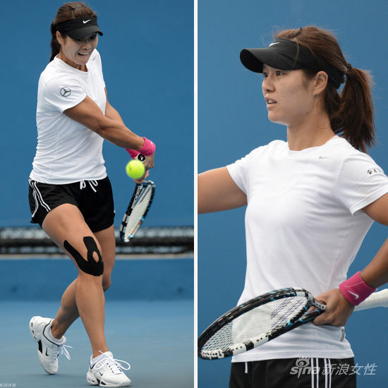 北京时间1月13日,李娜领衔众星备战即将开始的澳网比赛。身穿黑白搭配的运动服,简单利落,是运动的最基本款式。在很多场比赛中,黑色花朵图案的肌内效胶布,都出现在李娜的膝盖上。