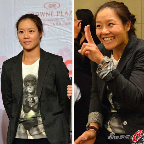 2012年WTA深圳金地网球公开赛,李娜亮相主办方发布会,摆“V”字pose卖萌。
