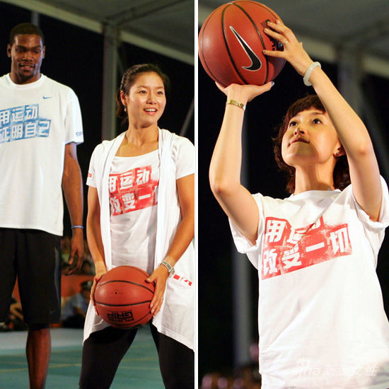 2011年7月10日,武汉,法网冠军李娜与NBA球星凯文-杜兰特出席耐克之夜活动。李娜助阵大玩篮球,白色纯棉T恤,梳着马尾,彰显青春活力。