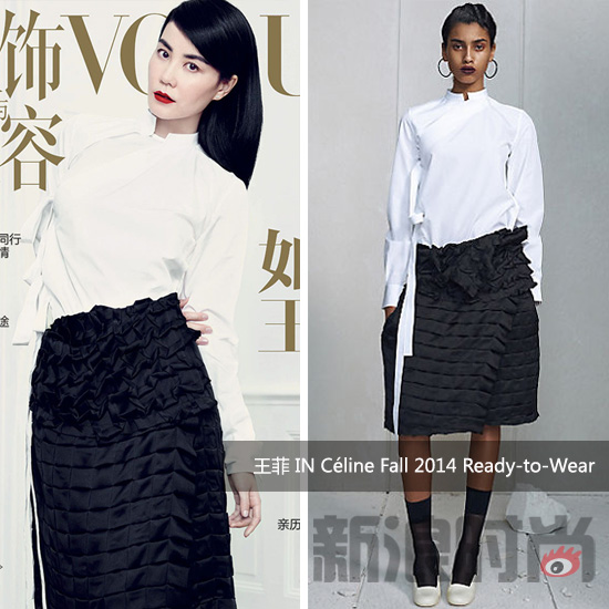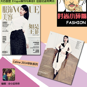 王菲身穿Celine 2014早秋系列登上《Vogue服饰与美容》封面王菲身穿Celine 2014早秋系列衬衫裙装、佩戴DEBEERS戴比尔斯钻石珠宝及TiffanyAndCo蒂芙尼白金镶钻戒指登上《Vogue服饰与美容》封面。淡然的妆发和简约的黑白色调凸显出封面POSE的复杂系数。或许天后就好这一口:平淡中不失亮点,简单中不丢霸气。当走过报刊亭看到这样的菲姐,相信谁也免不了唱上一曲“只是因为在人群中多看了你一眼..。.”