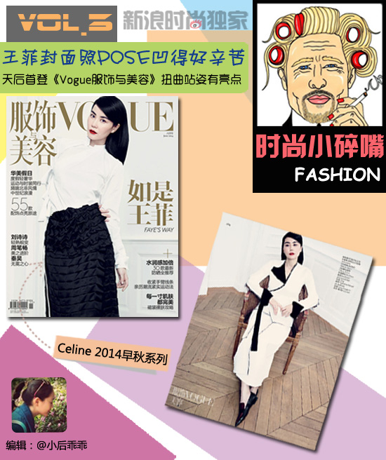 《Vogue服饰与美容》6月刊内页女星要有多大自信和气场才能在缤纷的时尚圈中一如既往地选择“自己最喜欢”的?王菲做到了。在《Vogue服饰与美容》6月刊中,王菲从封面到内页都挑选了Celine 2014的黑白款系列。那些将噱头放在高科技3D效果、宇宙唯一定制的所谓大牌们通通败下阵来。难怪有网友感慨到:其实她只要坐在那里、就已经很美。