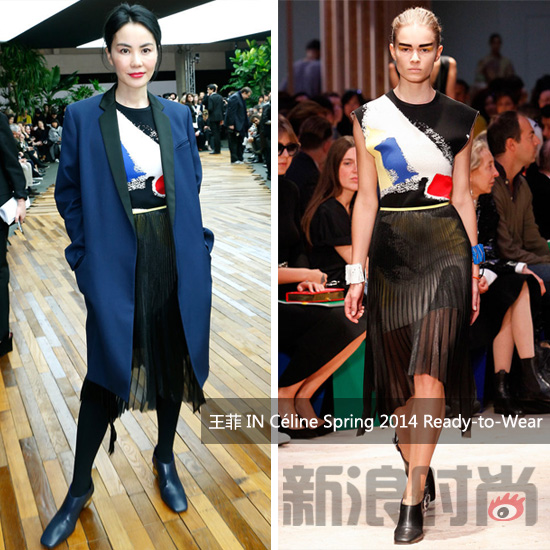 王菲现身Celine 2014秋冬巴黎专场秀王菲对于Celine 的喜爱有目共睹。在“国际时装周”闯入我们视野之前,王菲就曾数次飞抵巴黎助阵Celine专场秀。2014年早春,我们在Celine 2014秋冬的秀场上再次看到了王菲的身影。秀场上菲姐与《Vogue服饰与美容》杂志编辑总监张宇的合影相继传出,不知是否正是这场邂逅,成就了6月刊的封面故事。
