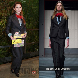 产后复出的天王嫂昆凌昨日一身西装造型亮相米兰时装周GUCCI秀场,这套西装look来自GUCCI 2015秋冬系列,深色西装上衣加宽松裤装,蓝色衬衣和领口红色花朵装饰,是古板中带点风骚的geek chic。纤瘦平胸的模特穿起来尚算文艺,长一张甜姐儿脸的昆凌穿起来再配上那双不知道什么鬼的圆头鞋,就像高中里为了不影响男同学学习,故意穿很土的教导主任,丑得用心良苦。