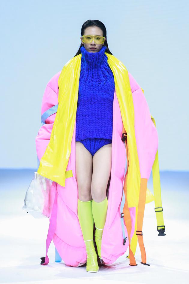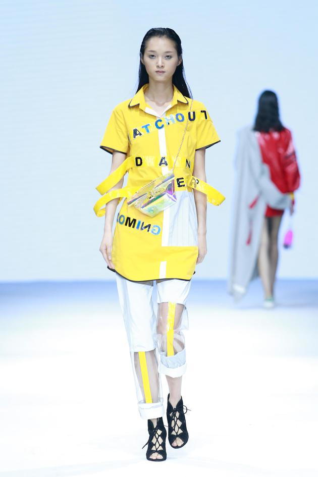 以环卫工人及道路标志的夜光特质为灵感,从斑马线,警告牌,警示标识等元素中提取出醒目且具有冲击力的色彩,结合水泥灰色的环保发光面料进行设计和制作。