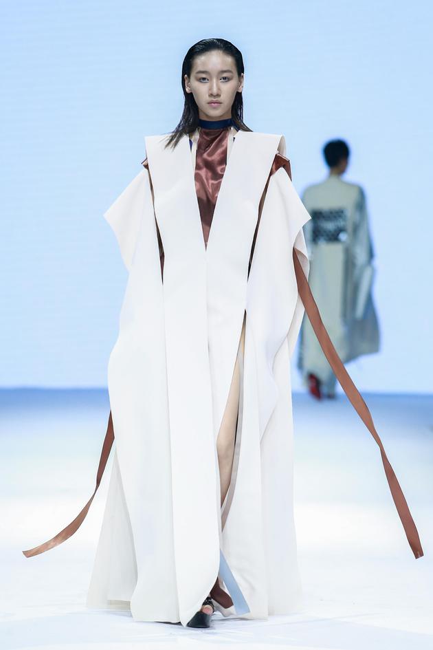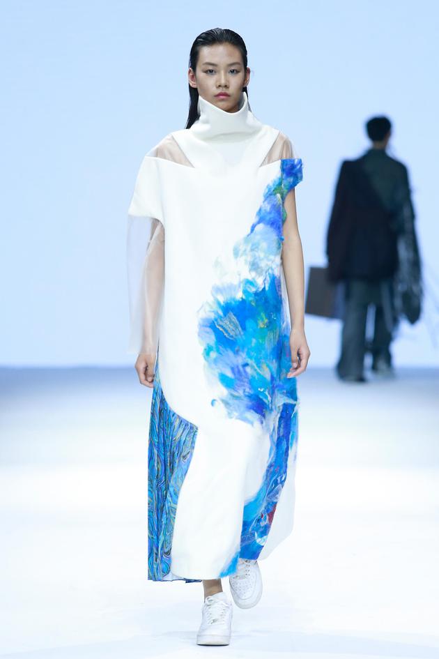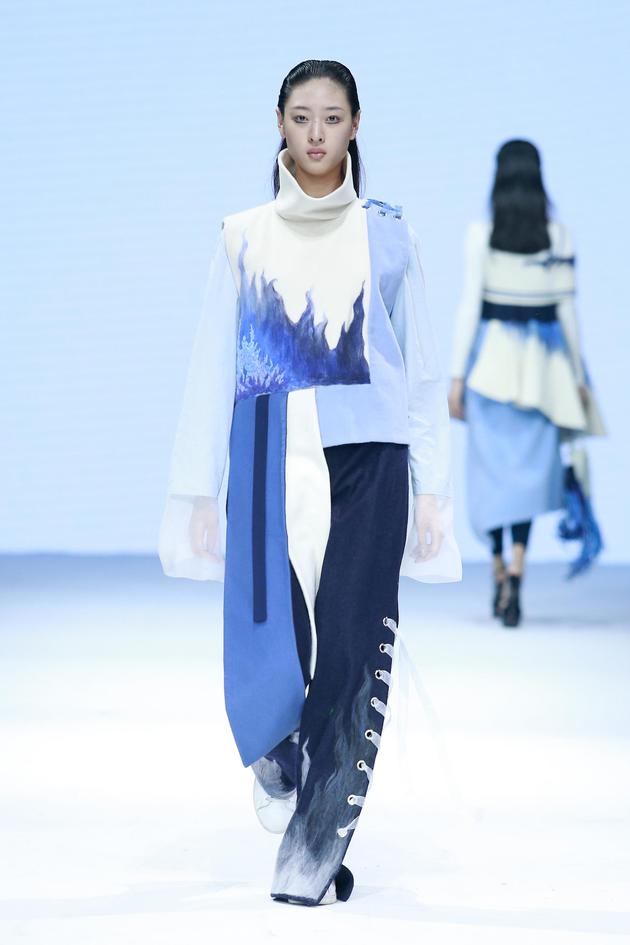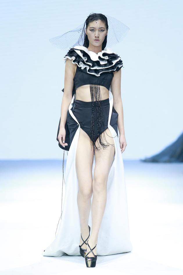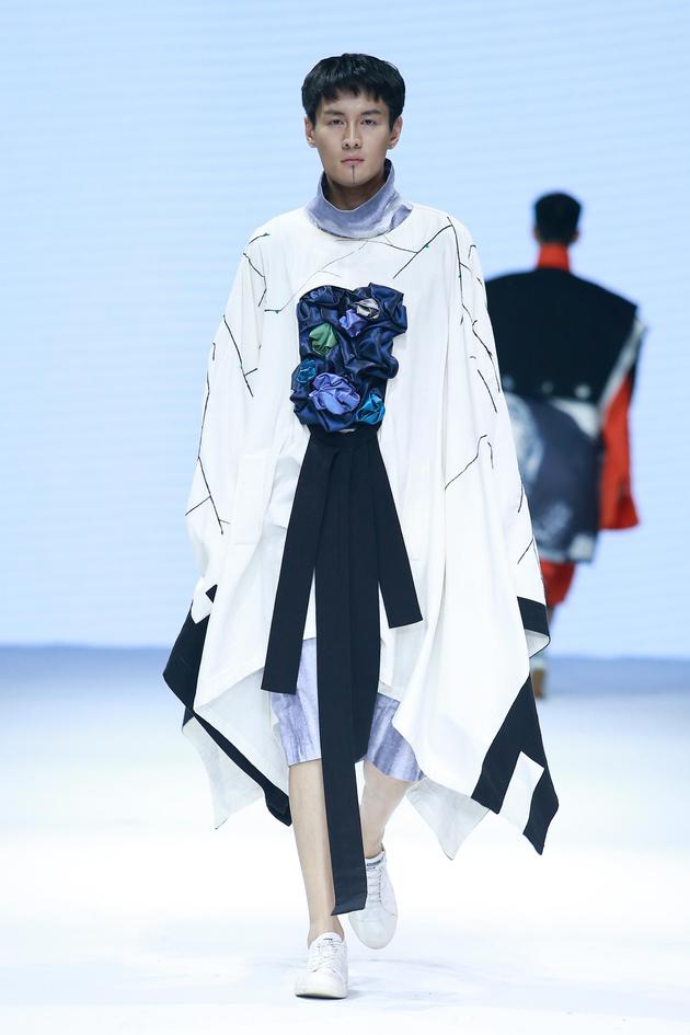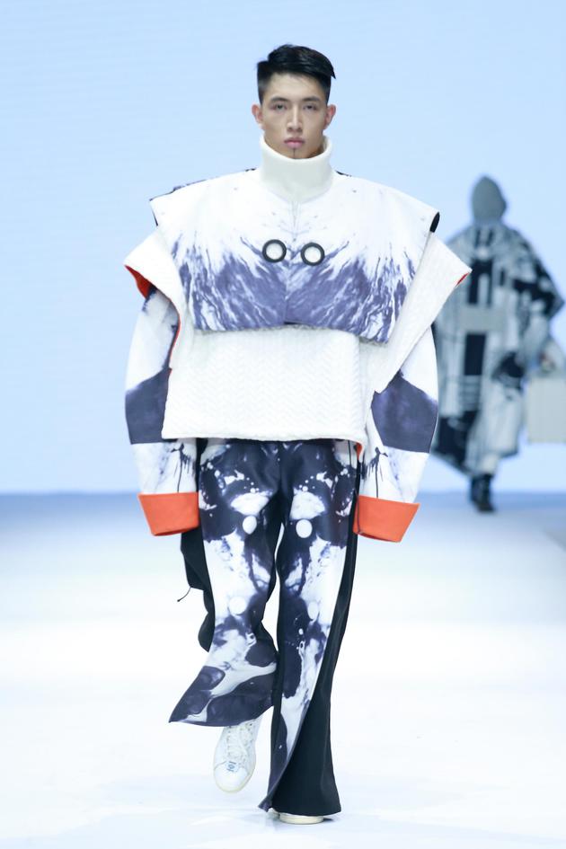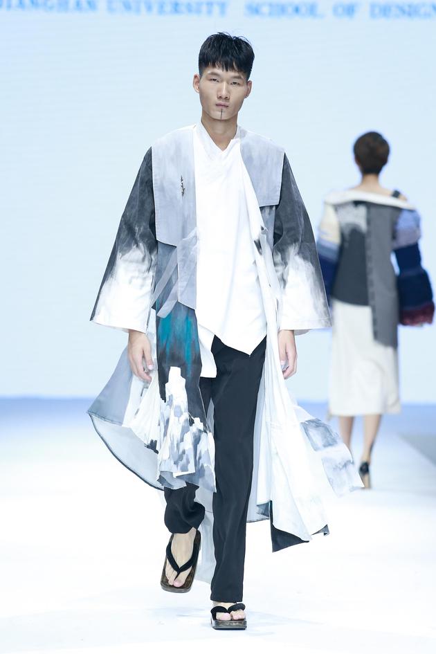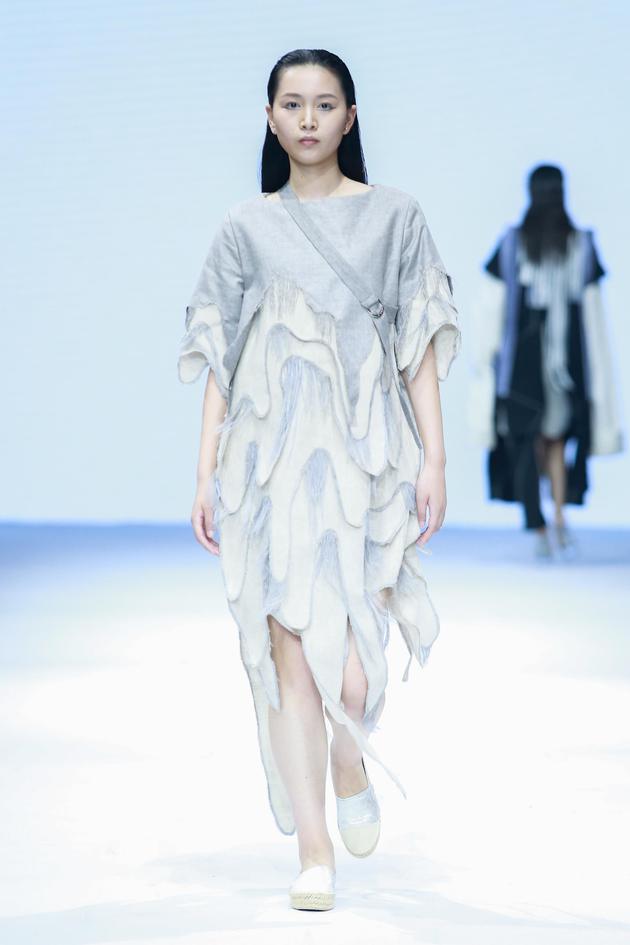 “ 城中有应林,城外有水域。推文门窗,清山绿水,古韵今风。”作品以苏州博物馆为灵感来源。 取之建筑中的黑白灰色调,运用肌理再造表达山水之物,表现服装的古韵。在工艺上利用数码喷绘以及汉秀等传统工艺相结合,展现错落的层次感。