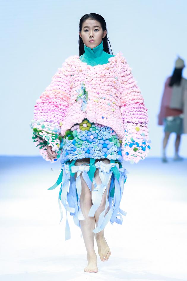 选用绿、粉两色进行搭配,展现植物生机盎然的状态。采用超粗毛线、手纺线、幻彩TPU、缎带、羊毛毡五种材料进行混织,形成趣味性的肌理效果。配以茧形及A形廓形,烘托出少女的朝气与可爱。
