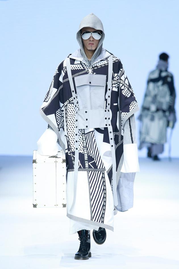 以Roy Lichtenstein最著名的漫画和广告风格绘画,将他的抽象绘画转化成黑白灰色调,用数码印花的形式表现在服装上。朴素简洁的黑白灰色调和复杂多样的图形相搭配,与趣味性的结构设计相呼应。