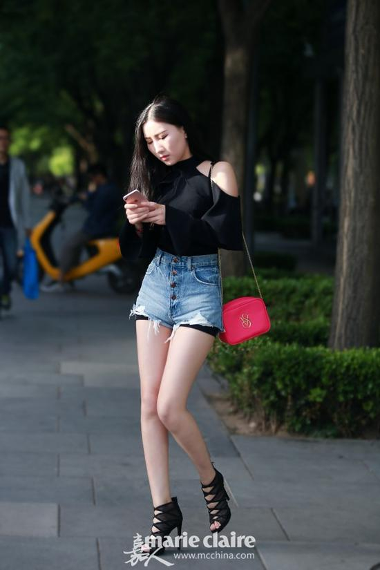 一字肩上衣搭配热裤,性感的肩膀增添了女人味。