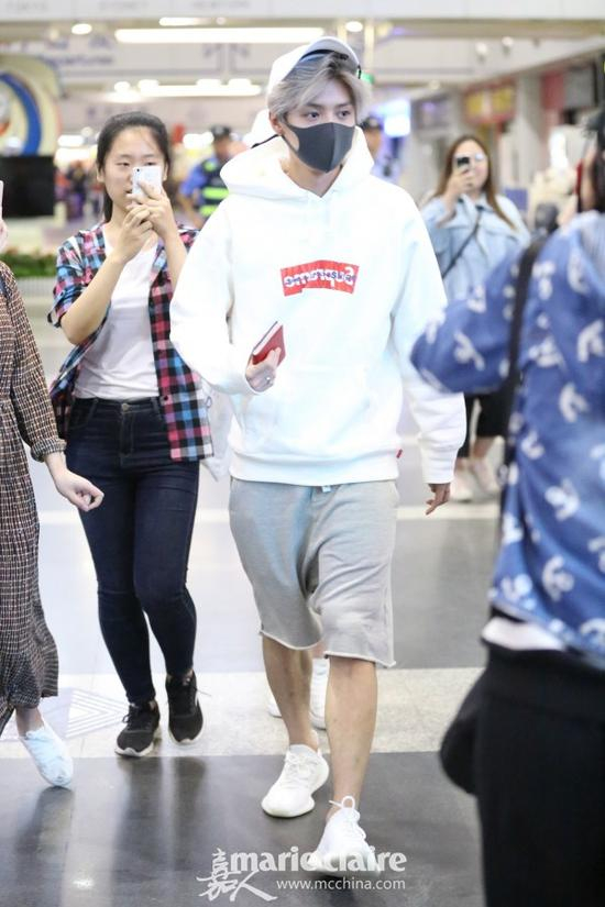 鹿晗戴白色鸭舌帽,黑色口罩遮面,身穿Louis Vuitton×Supreme白色Logo印花帽衫,下穿灰色短裤,脚踩Yeezy白色运动鞋现身机场。加上后边跟随的迷妹,整体像极了大学校园里万人瞩目的小草模样,一度帅到迷妹们无法呼吸。