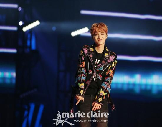 鹿晗身穿Moschino 2017春夏系列印花刺绣铆钉机车夹克,内搭朋克图案圆领T恤,下身穿黑色紧身休闲裤。在舞台上唱歌跳舞的鹿哥简直就是自带光环的。