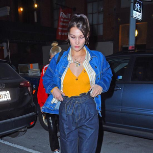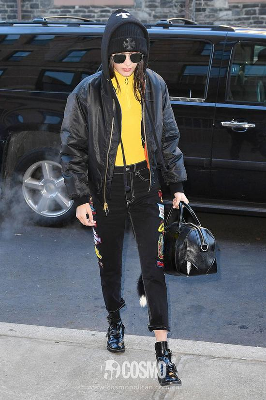 高领拉链款的黄毛衣复古又摩登,贝拉·哈迪德这身就酷得有点忧郁呢。