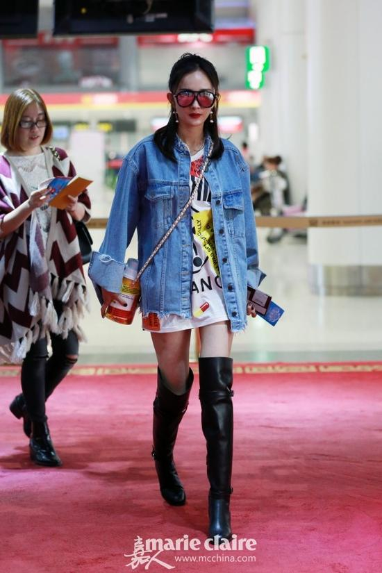 也可以是戴着Alexander McQueen金属色镜面墨镜,身穿Stylenanda蓝色毛边牛仔夹克,内搭Moschino白色印花T恤,肩背Moschino药瓶包,脚踩Christian Louboutin黑色粗跟过膝靴,佩戴Moschino耳饰。