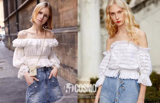 COCO今年真的买了不少露肩款,其中小平肩最多,也在店里试出了一些经验。下面两款很像,但有荷叶边装饰的上身效果却比右边显瘦很多。
