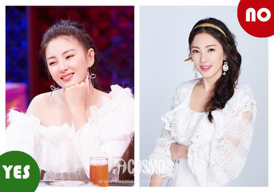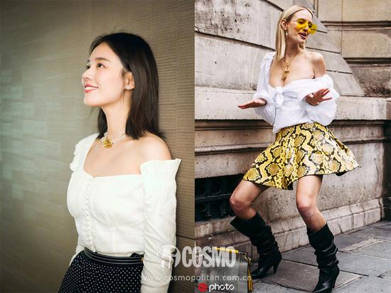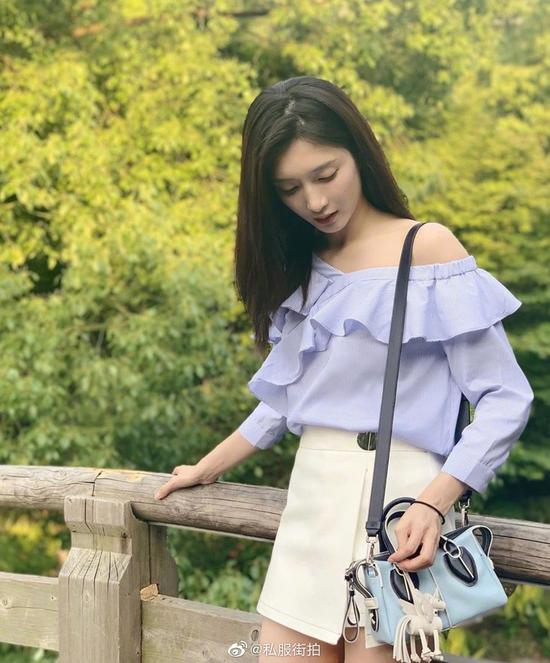 荷叶边白衬衫,张雨绮把领口往旁边扯一扯显瘦得多,对于大骨架的姑娘来说,适度露肤是日常凹造型的必备准则。