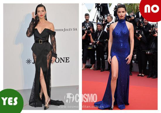 还有怎么露也是很有技巧的,穿上小平肩黑色礼服的Adriana Lima是天神下凡,但换上高领挂脖礼服整个人就显得臃肿不少了。