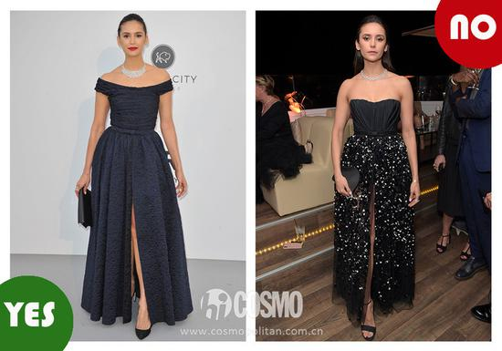 不过也不是露得越多就越好看,比如妮娜·杜波夫的一字肩礼服就远比抹胸要显得贵气得多。