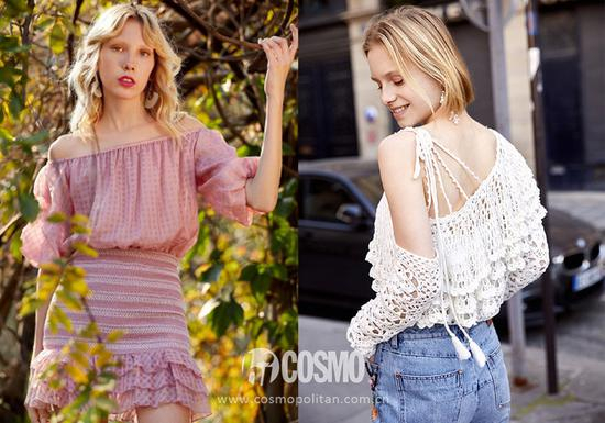 其次COCO在试衣服的还看到有网面、纱质等各种材质的露肩款,COCO试衣的经验是织物比较粗的面料上身效果都显胖。比如右边的网状露肩款就远不如这件质地比较轻盈的半透视上衣好驾驭,即使它有荷叶边装饰。