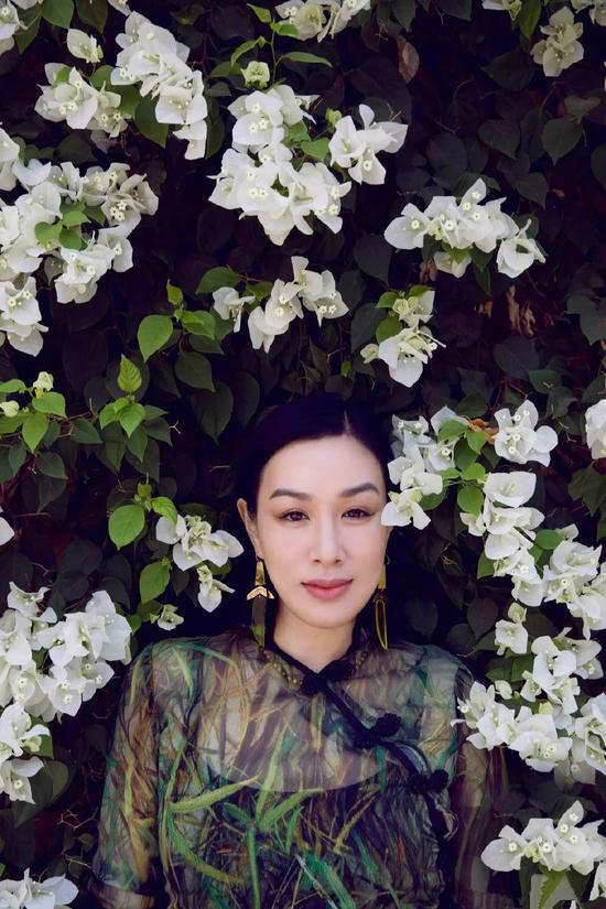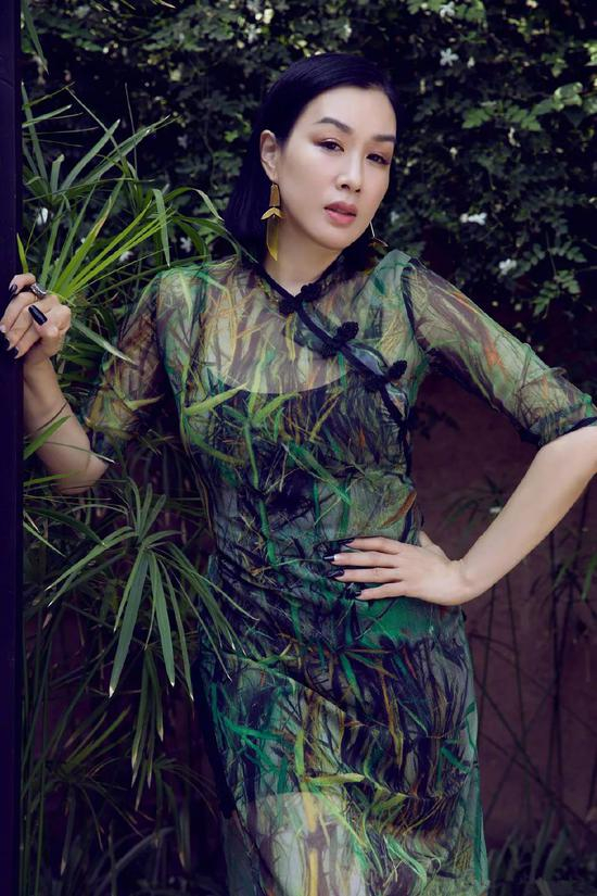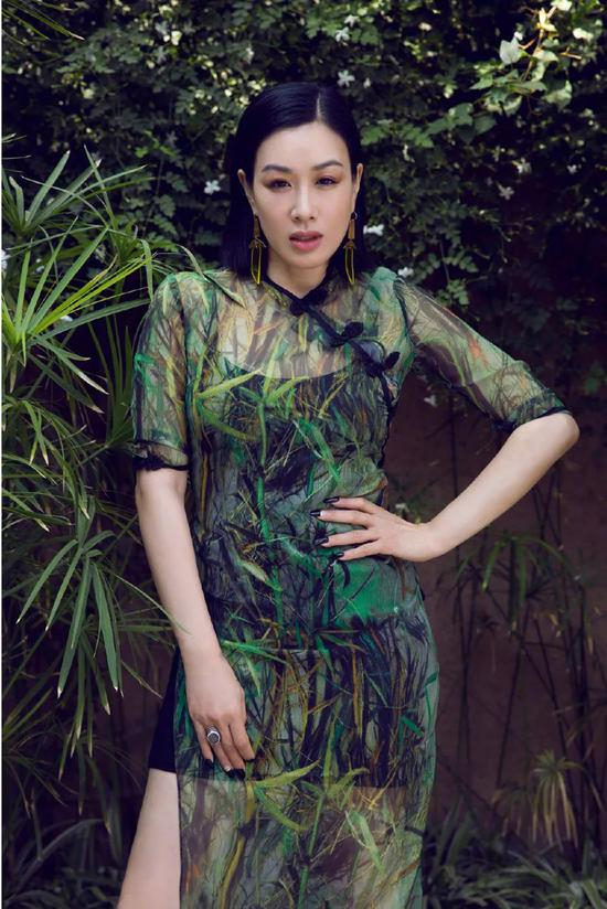要说我们寻常所见到的旗袍无非是丝绸或是棉麻面料,而像钟丽缇所穿的这袭旗袍,则运用的是薄纱质地,第一眼看便觉得足够与众不同。而在薄纱面料的基础上,裙身又印有大面积草木印花作为渲染,使得整体更富有古韵气息。